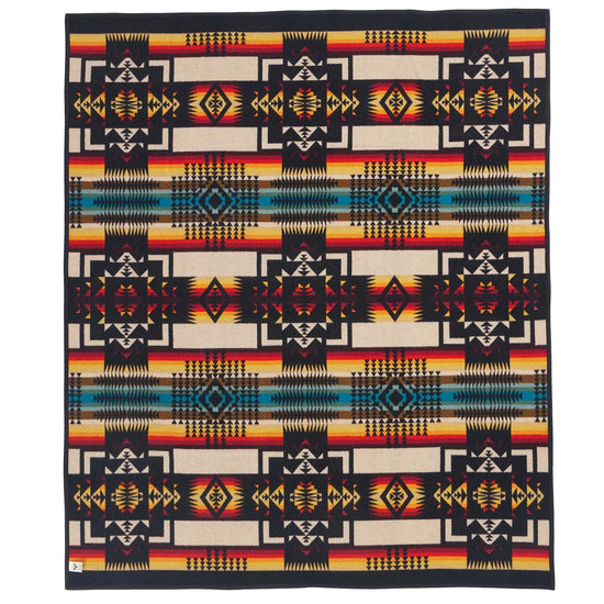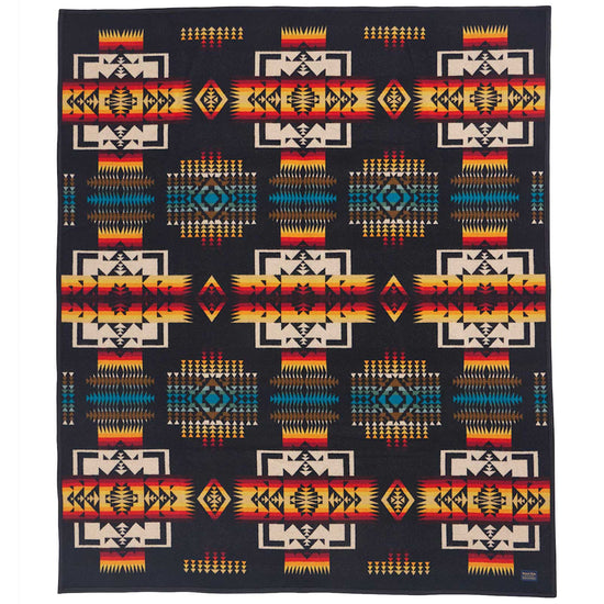 First woven in the 1920s, this USA-made wool blanket has been one of our most popular designs ever since. Chief Joseph led the Nez Perce tribe native to northeastern Oregon in the late 1800s. Widely admired for protecting his people and speaking the truth, he is honored with this design, symbolizing bravery. Bold arrowheads represent the chief's courage, strength and integrity. Reverses for two different looks.